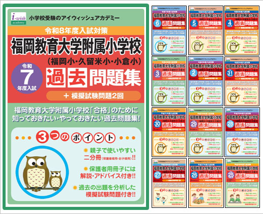 25/9/5 2025年度第09回 アイチャレンジ 試験を開始します。アイチャレンジ会員の方はメールでお知らせするパスワードをご確認の上、ログインページへ。 25/8/29 第08回 アイチャレンジ 講評を公開しました。ログインページへ。 25/8/21 第08回 アイチャレンジ 解答を公開しました。ログインページへ。 25/8/6 福岡教育大学附属小学校 令和7年度入試過去問題集 新発売!!